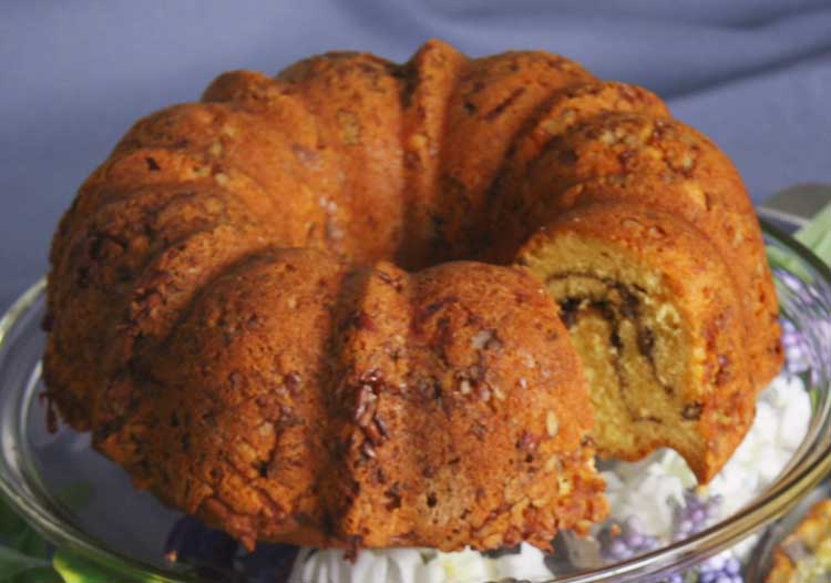 Turn the silicone Bundt pan upside down over the serving platter and gently move the sides and shake the pan until the cake comes out cleanly on the platter.